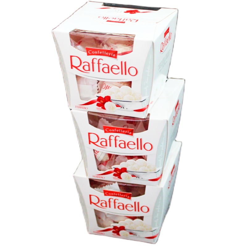 Три коробки конфет Raffaello с цельным орехом в кокосовой обсыпке по 150 грамм каждая. Суммарно 450 грамм конфет от Ferrero. Мы продаем только оригинальную продукцию, которую продаем с минимальной наценкой, поэтому можем позволить себе участие в любых акциях. Будем рады Вашим заказам.