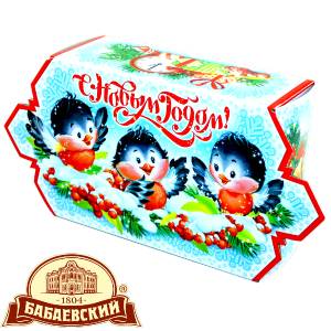 Бабаевские конфеты и шоколад в красивой и яркой упаковке с очаровательными снегирями.