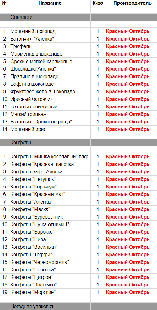 Молочный шоколад (1 шт), Батончик с начинкой "Аленка" (1 шт), Трюфели (1 шт), Мармелад в шоколаде (1 шт), Жареный арахис и карамель (1 шт), Шоколадка "Аленка" (1 шт) ,Пралине в шоколаде (1 шт), Вафли в шоколаде (1 шт), Фруктовое желе в шоколаде (1 шт), Ирисный батончик (1 шт), Батончик сливочный (1 шт), Мягкий грильяж в шоколаде (1 шт), "Ореховая роща" (1 шт), Молочный ирис (1 шт), Конфеты "Мишка косолапый" (1 шт), Конфеты "Красная шапочка" (1 шт) ,Конфеты "Аленка" (1 шт), Конфеты "Петушок" (1 шт), Конфеты "Кара-кум" (1 шт), Конфеты "Красный Мак" (1 шт), Конфеты "Киви" (1 шт), Конфеты "Маска" (1 шт), Конфеты "Буревестник" (1 шт), Конфеты "Ну-ка отними!" (1 шт), Конфеты "Барокко" (1 шт), Конфеты "Нива" (1 шт), Конфеты "Васильки" (1 шт), Конфеты "Тоффи" (1 шт), Конфеты "Черноморочка" (1 шт), Конфеты "Мама приехала" (1 шт), Конфеты "Цитрон" (1 шт), Конфеты "Ласточка" (1 шт), Конфеты "Морские" (1 шт)